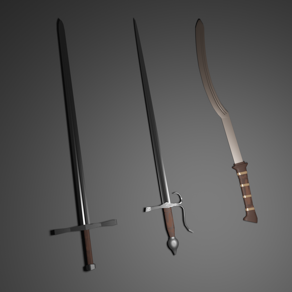 A royalty-free 3D model of three swords, supplied as a single Blender file including simple materials. I use these swords in my renders and digital paintings.